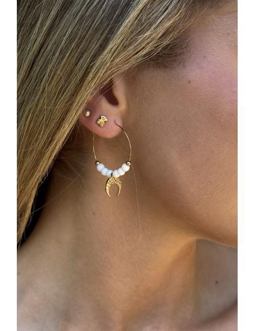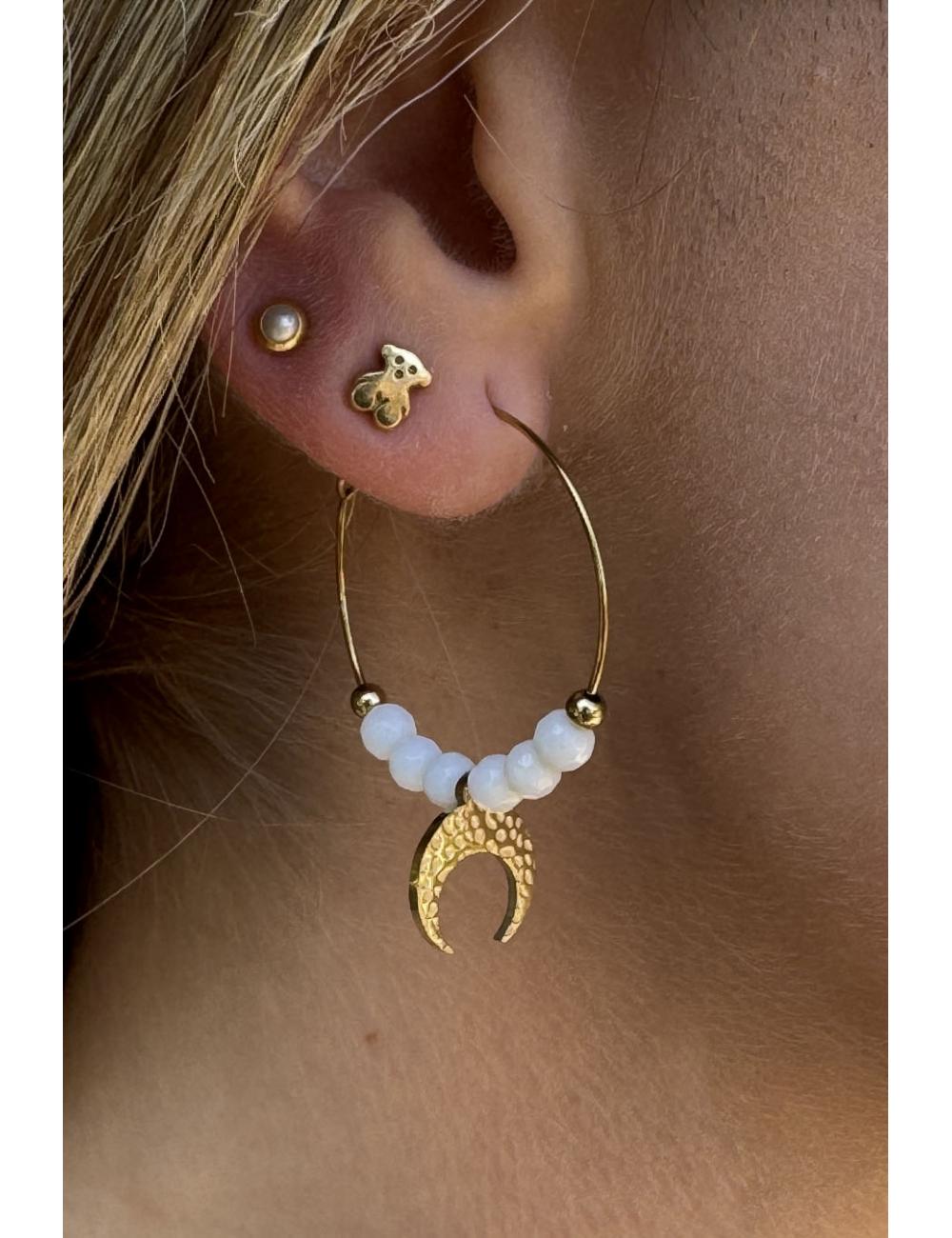 Pendientes de aro fino dorado con detalle de bolitas blancas a contraste y luna dorada.