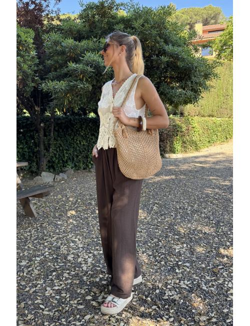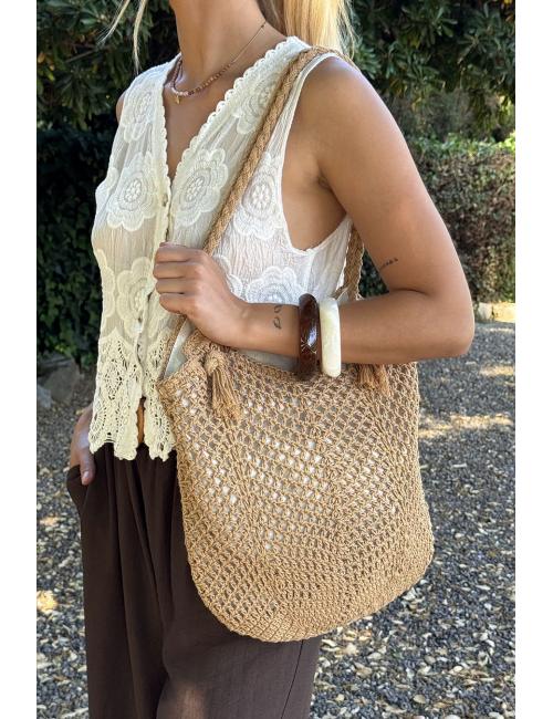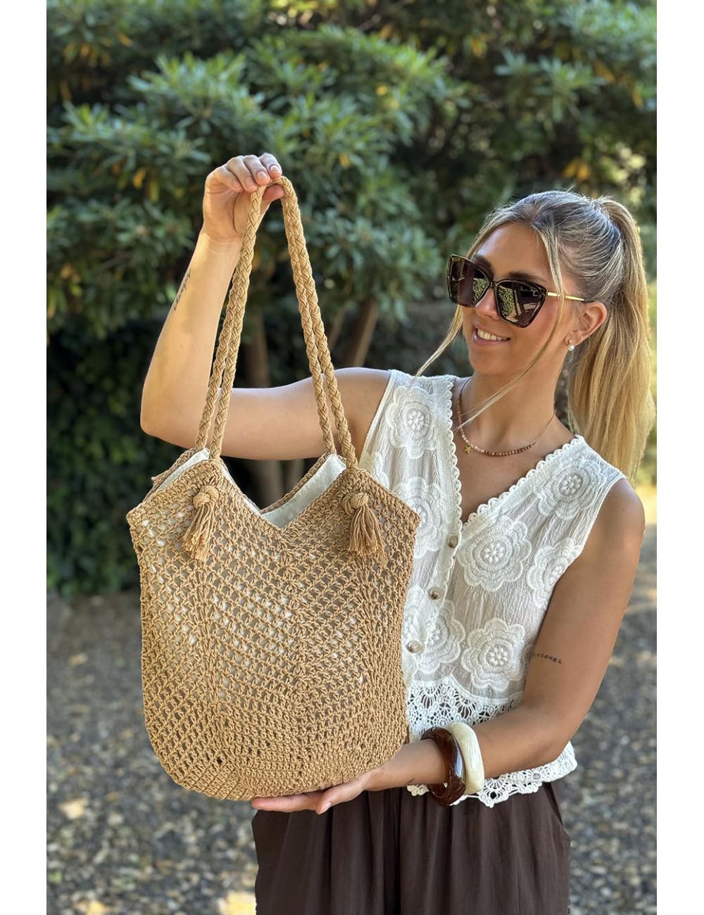 Bolso mediano de crochet. Doble asa con detalle de borla en el mismo tejido y tonalidad. Ideal para llevar al hombro o en la mano. Cierre superior con cremallera.