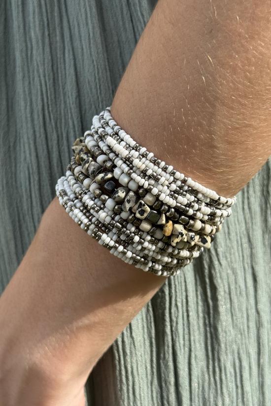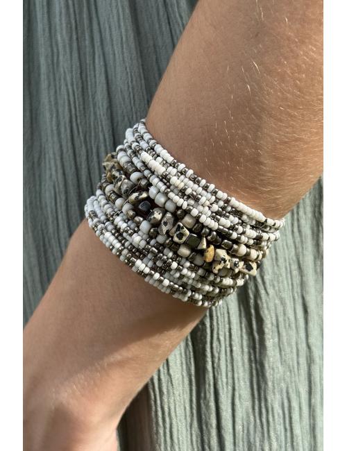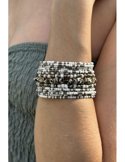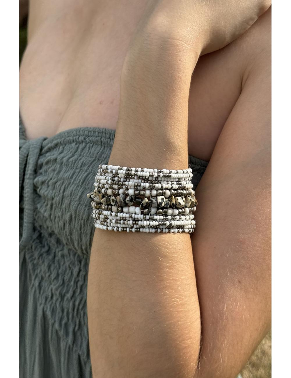 Set de pulseras elásticas compuestas de múltiples abalorios anacarados y metálicos de diferetes tamaños en tonos tierra, grises y blancos.
