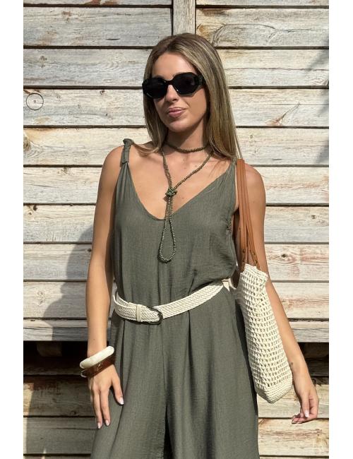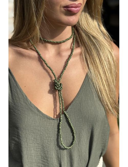 Collar largo de estilo bohemio compuesto por mini bolitas de madera en tonos verdosos. Para llevar con doble vuelta.