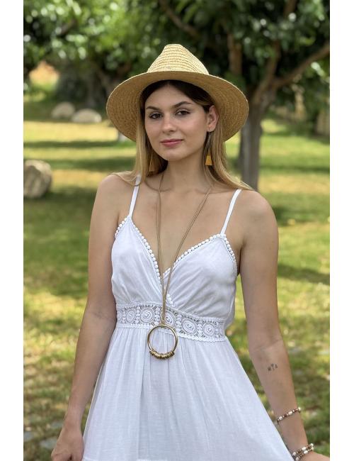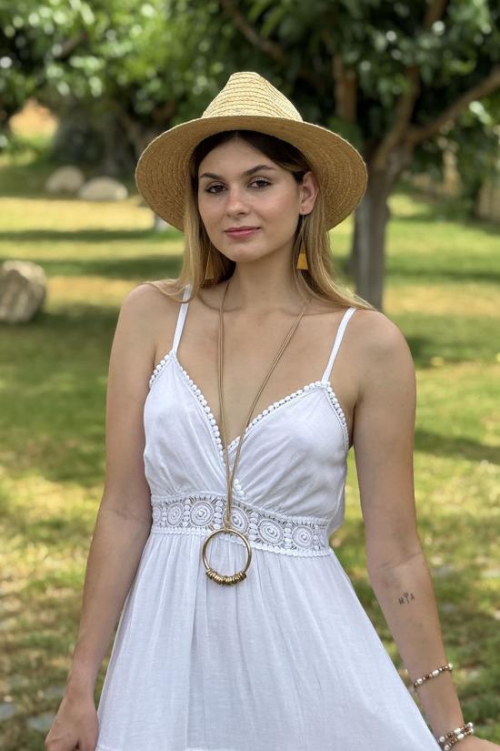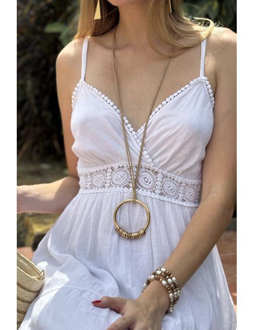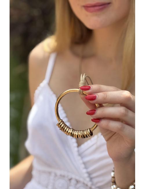 Collar largo compuesto por una cuerdecita con un aro grande dorado del que cuelgan múltiples de aros pequeños.