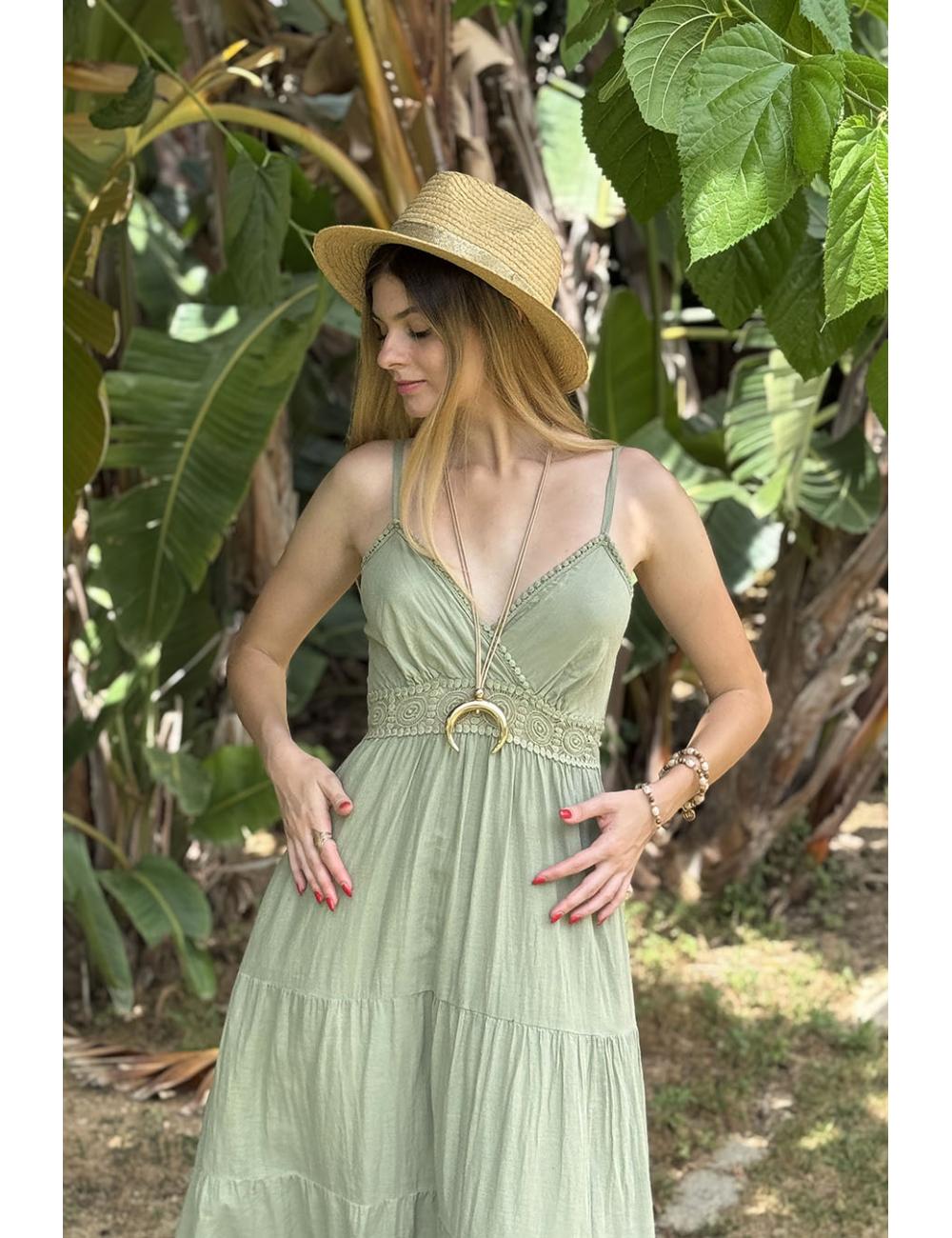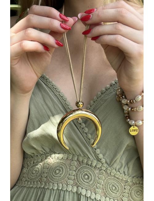 Collar largo compuesto por una cuerdecita con una media luna grande dorada.