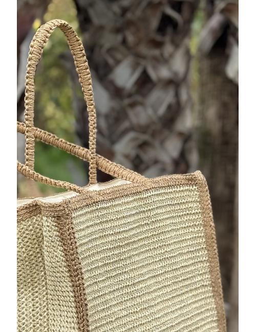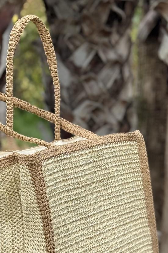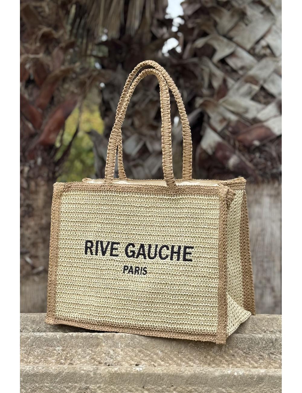 Capazo mediano confeccionado en rafia texturada con la inscripción en relieve "Rive Gauche Paris". Incluye asas de hombro y de mano, de estilo bohemio, es práctico y versátil. Cierre con cremallera superior central.