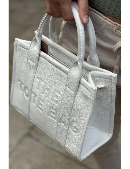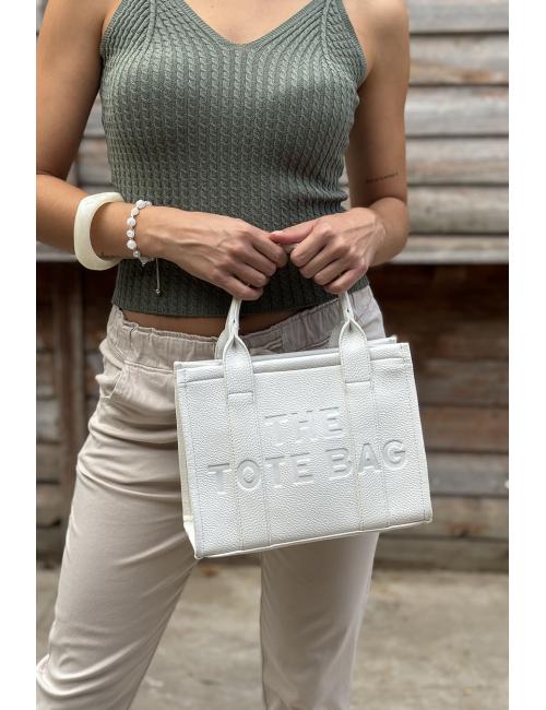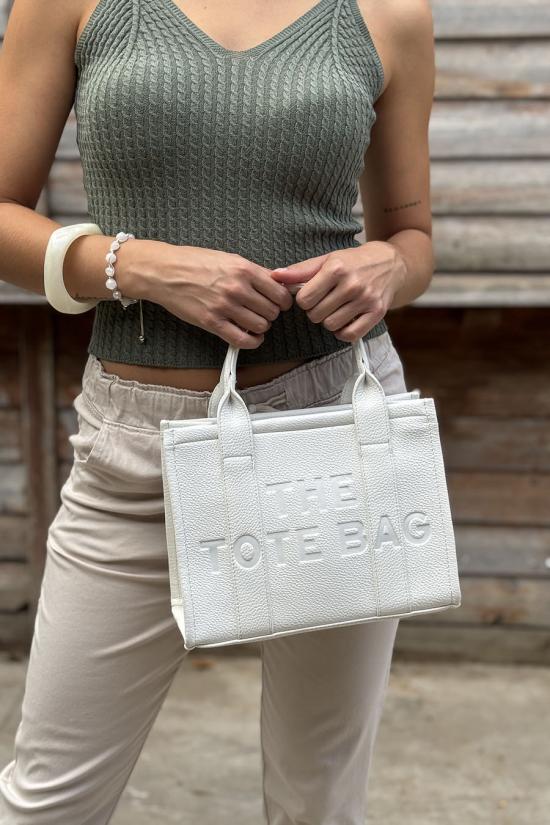 Bolso pequeño confeccionado en polipiel texturada con la inscripción en relieve "The Tote Bag". Incluye asas de hombro y de mano, de estilo urbano, práctico y compatible con todo tipo de outfits. Cierre con cremallera superior central.