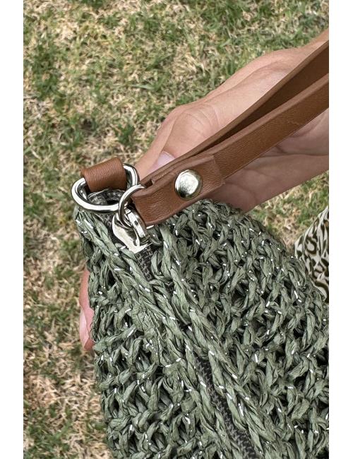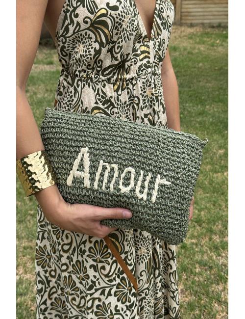 Bandolera rectangular confeccionada en rafia tintada con inscripción "Amour" a contraste. Consta de un asa de polipiel y cierre superior de cremallera.
