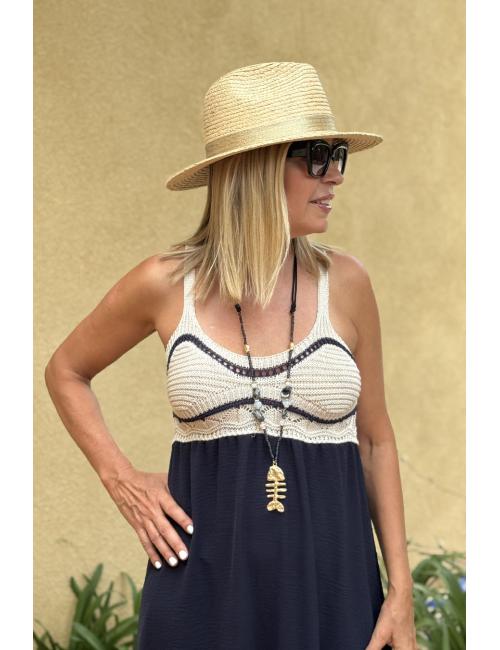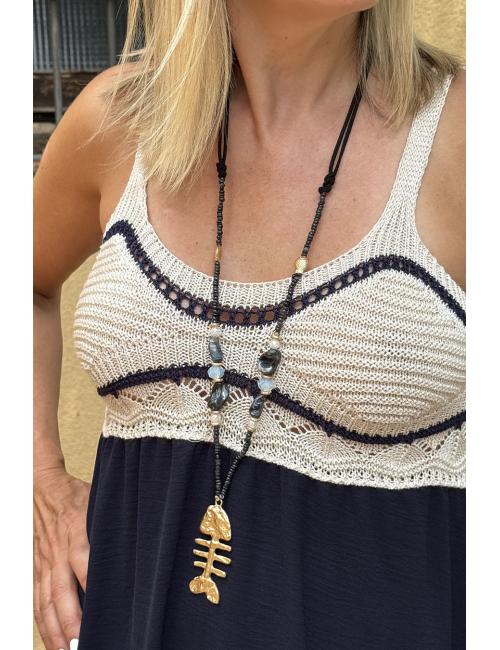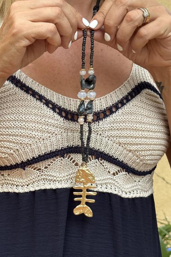 Collar largo compuesto por una cuerdecita negra adornada con piedrecitas y abalorios marineros. Raspa dorada grande al final del collar.