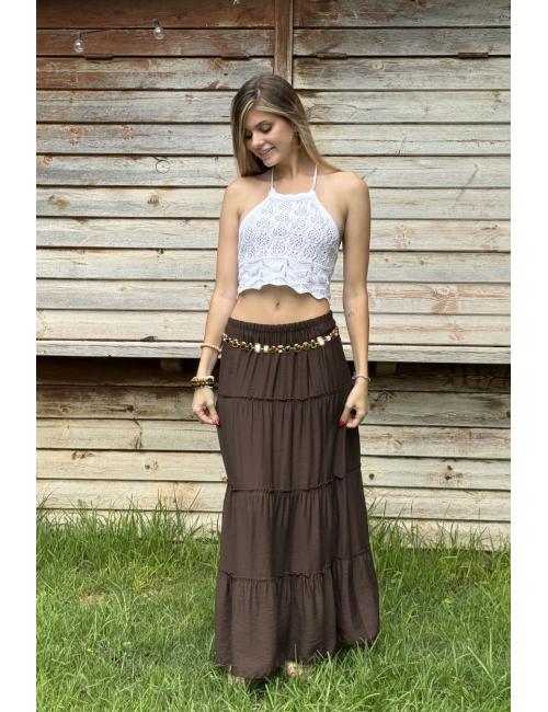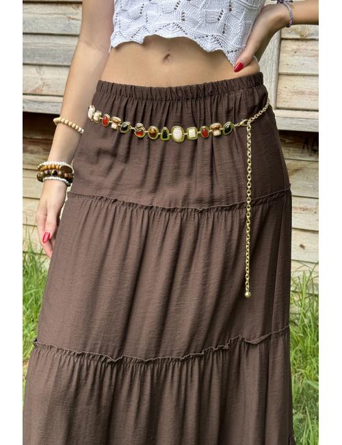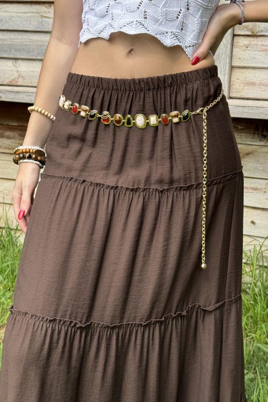 Cinturón de cadena dorada con piedras y abalorios de diversos tamaños y acabados. La cadena tiene una bola dorada pequeña al final. Ideal para complementar tu falda, pantalón o bermuda.