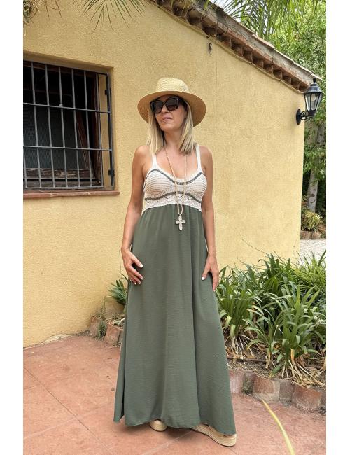 Collar largo compuesto por una cuerdecita negra y una cadena adornada con perlas anacaradas. Cruz dorada redondeada y rellena de piedrecitas y perlas.