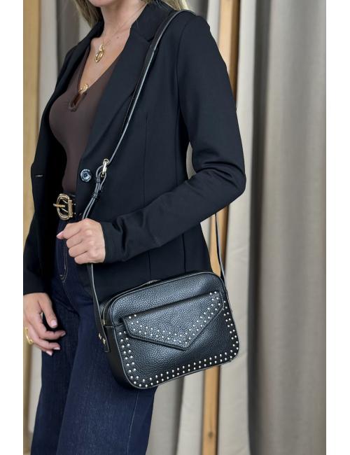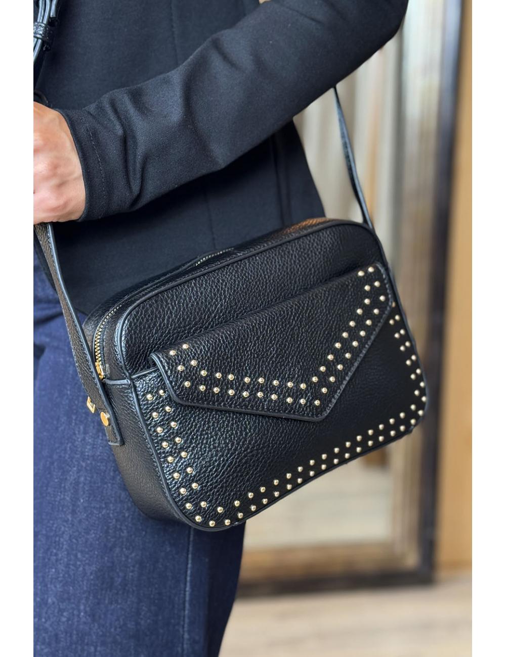 Bolso bandolera confeccionado en piel sintética negra texturada. Cierre superior con cremallera y asa al hombro regulable en altura. Detalle de doble ribete de tachuelas pequeñas doradas delante en el perímetro y en la solapa. Detrás es lisa e incorpora un compartimento cerrado con cremallera.