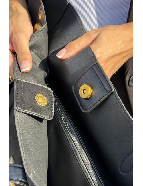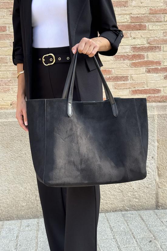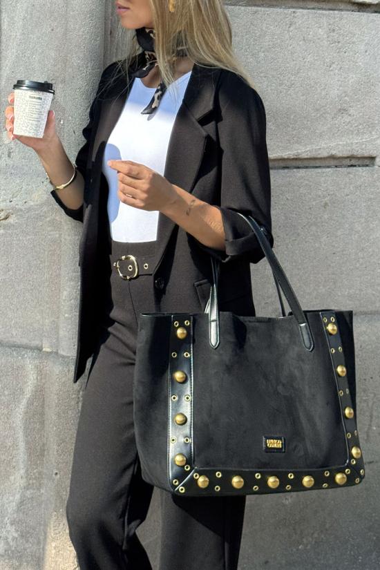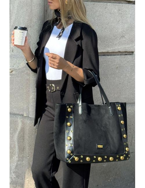 Boso grande estilo shopper confeccionado en antelina y piel sintética. Dos asas para llevar al hombro o en mano. Delante incluye tachuelas grandes y pequeñas doradas. Liso detrás. Cierre principal con botón a presión.