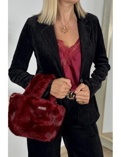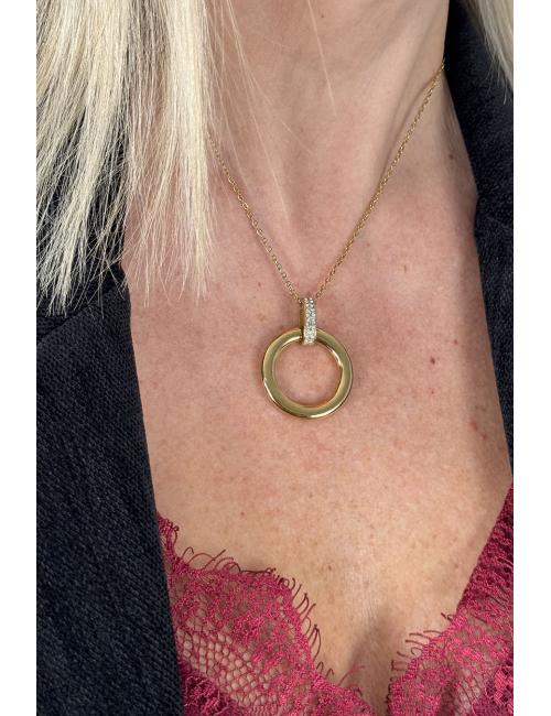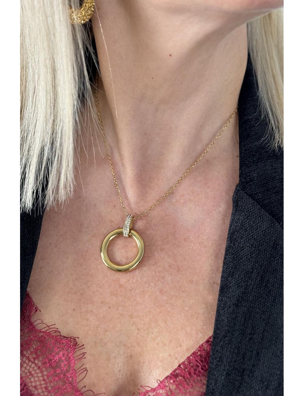 Collar corto de acero dorado. Compuesto por cadena fina y anillo grueso de formas redondeadas y brillantes en el soporte.