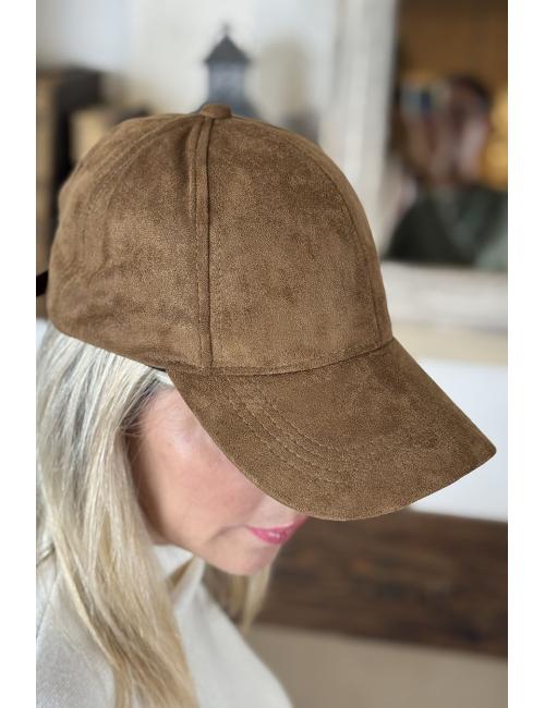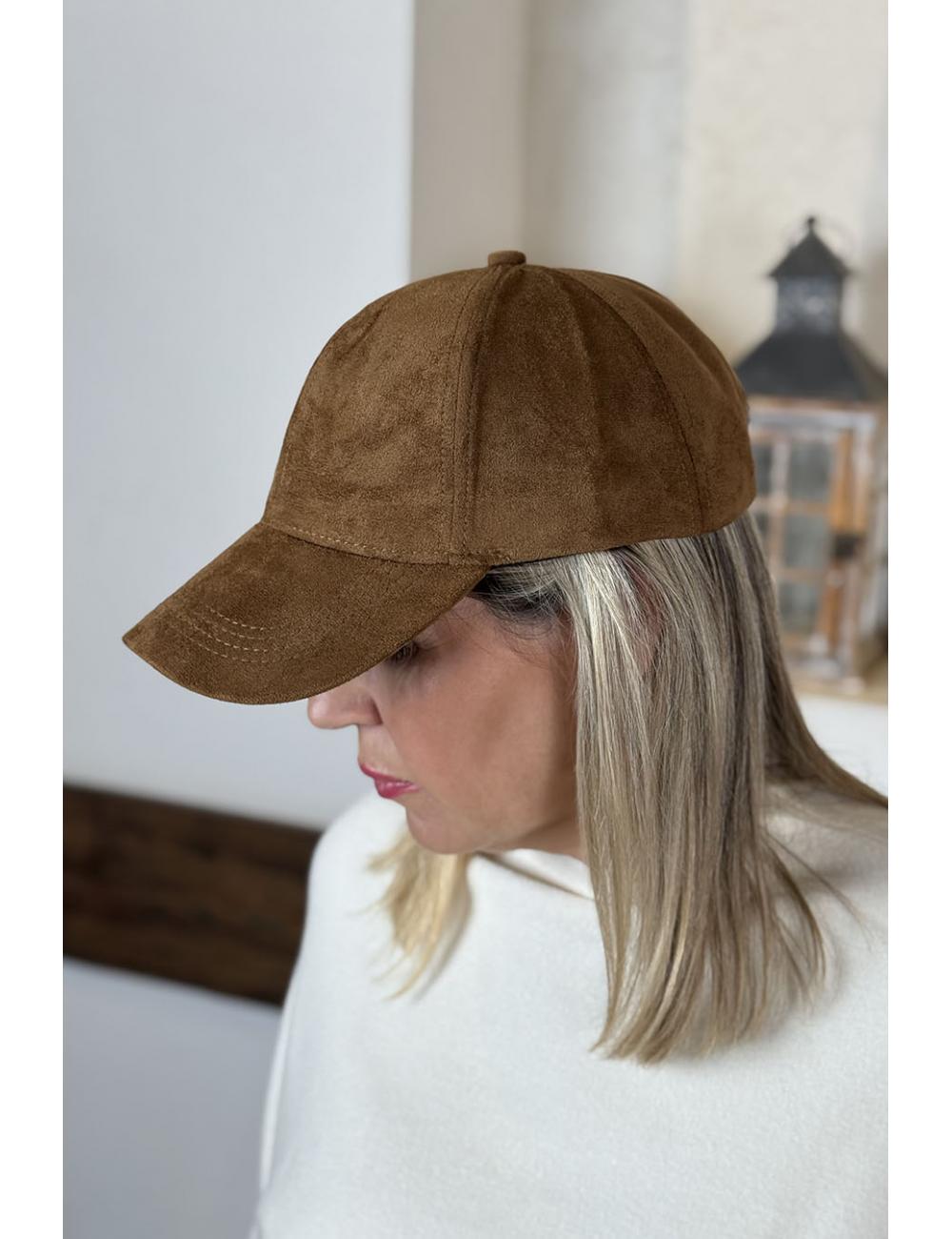 Gorra confeccionada en tejido de antelina en acabado serraje. Ajuste en la parte trasera con hebilla metálica.
