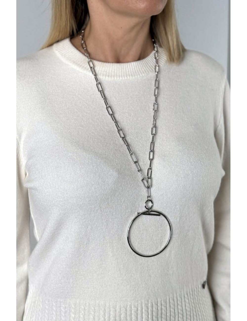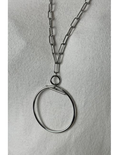 Collar largo de acero plateado. Cadena formada por eslabones entrelazados y rematado con aro fino grande. Dale un toque de distinción a tus outfits urbanos o de fin de semana con este collar que podrás ponerte tal cuel o hacerlo doble en modo gargantilla.