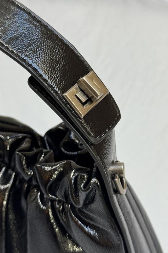 Bolso mini fruncido efecto piel gloss. Cierre metálico invisible en parte superior. Incluye un asa larga para hombro de polipiel. Atrévete con este bolso y dale a tu outfit un toque brillante y sofisticado.