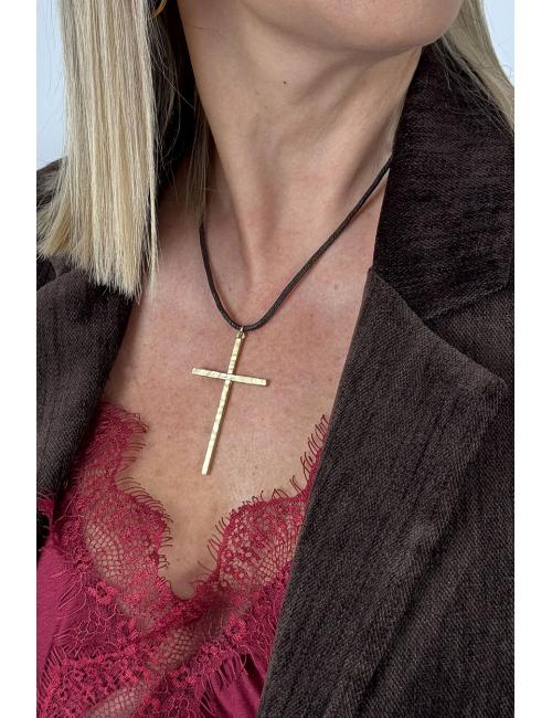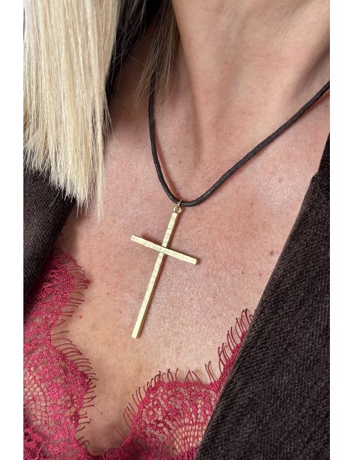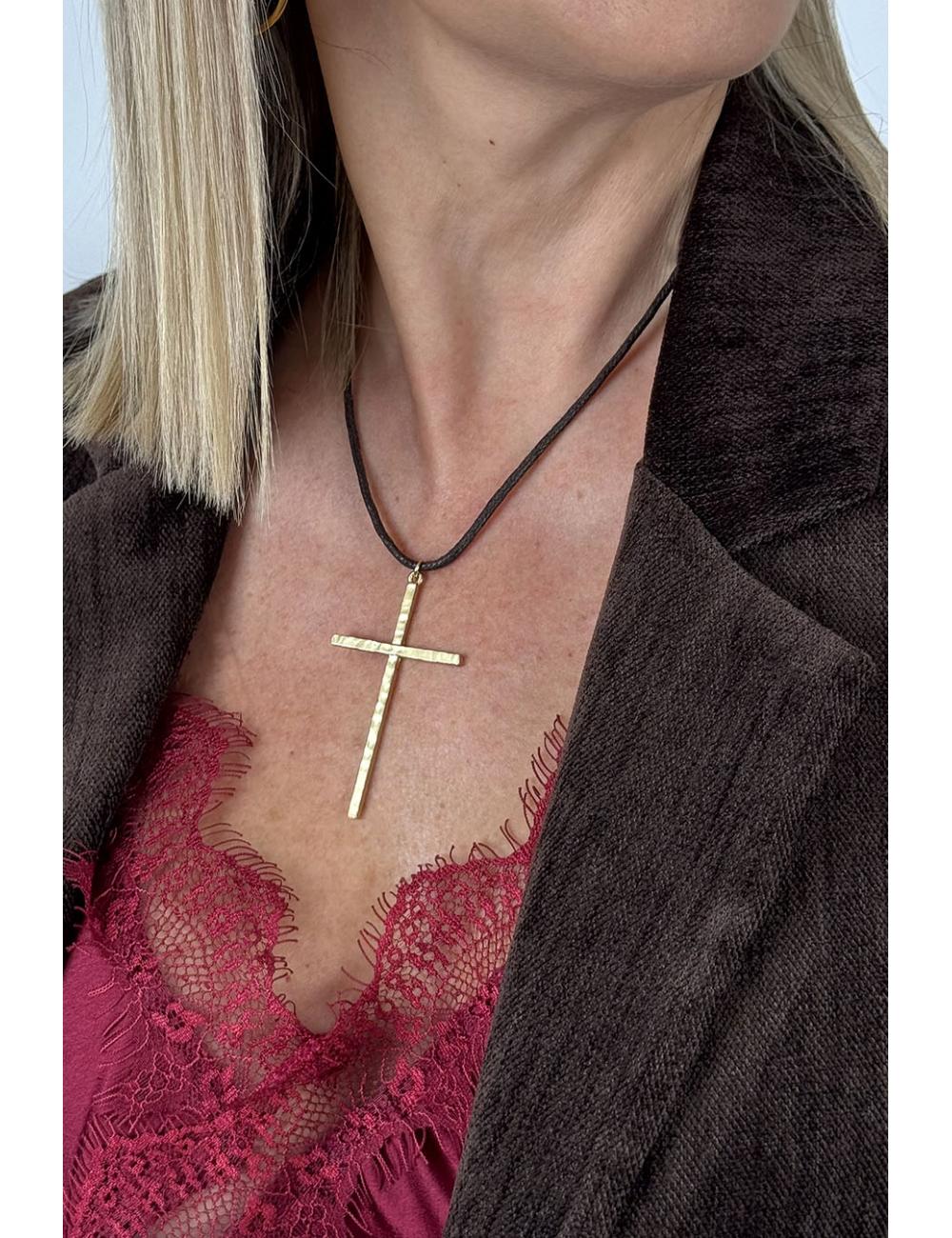 Collar compuesto por una cuerdecita marrón de longitud regulable y una cruz metálica gold de textura ondulada.