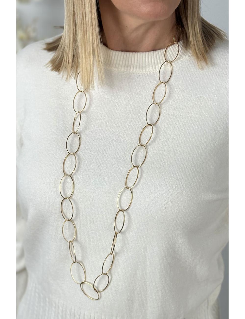 Collar largo de acero dorado compuesto por eslabones encadenados. Puedes llevarlo largo o doble como si fuera una gargantilla.