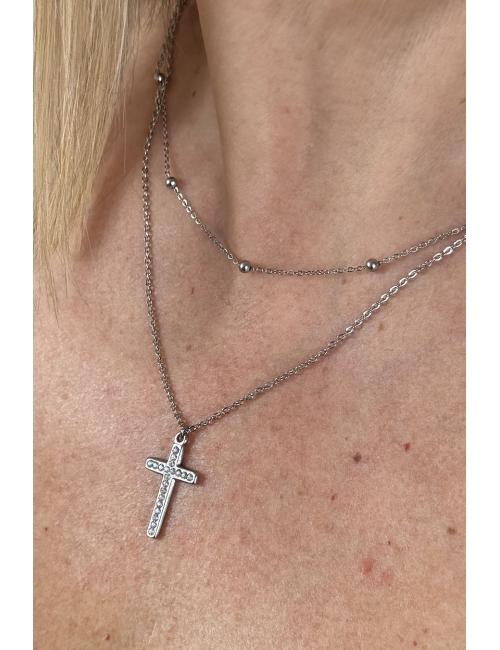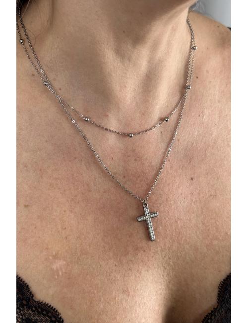 Gargantilla doble compuesta por cadena fina plateada con iserciones de bolitas y detalle de cruz con inserciones de brillantitos.