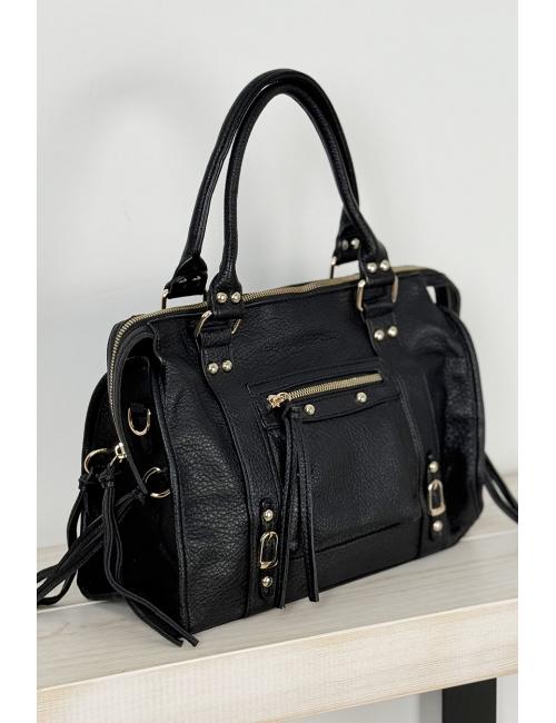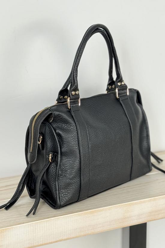 Bolso grande de mano, confeccionado en piel sintétia texturada. Detalle de tacjuelas doradas y tiras en cremalleras. Incluye asa larga extraíble para llevar al hombro.