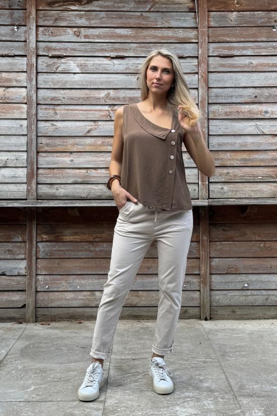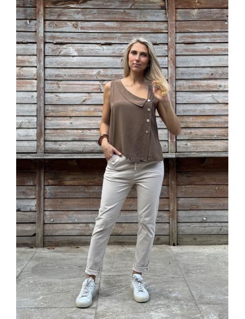 Blusa bohemia sin mangas confeccionada en crepé algodón, lisa y fluída. Cuello camisero asimétrico y cierre con 4 botones anacarados en un lateral.