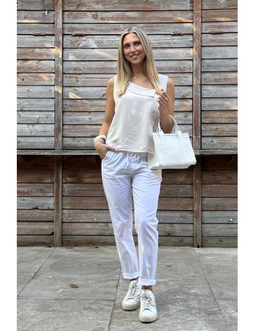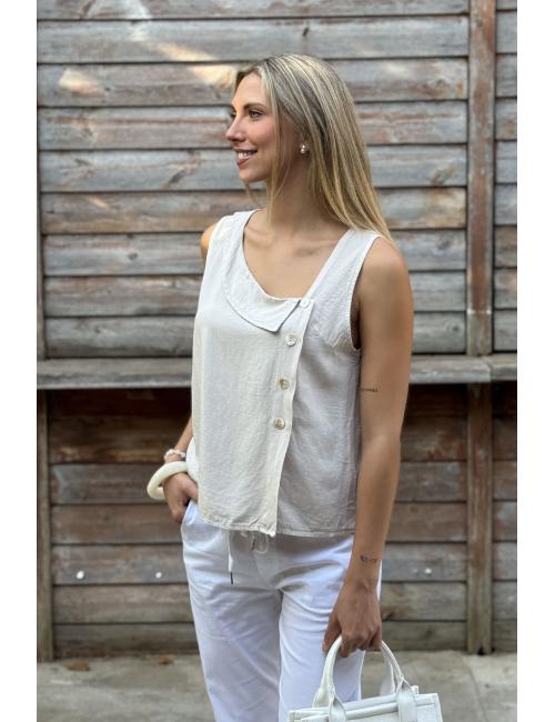 Blusa bohemia sin mangas confeccionada en crepé algodón, lisa y fluída. Cuello camisero asimétrico y cierre con 4 botones anacarados en un lateral.