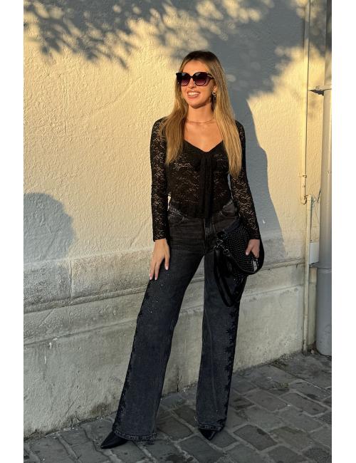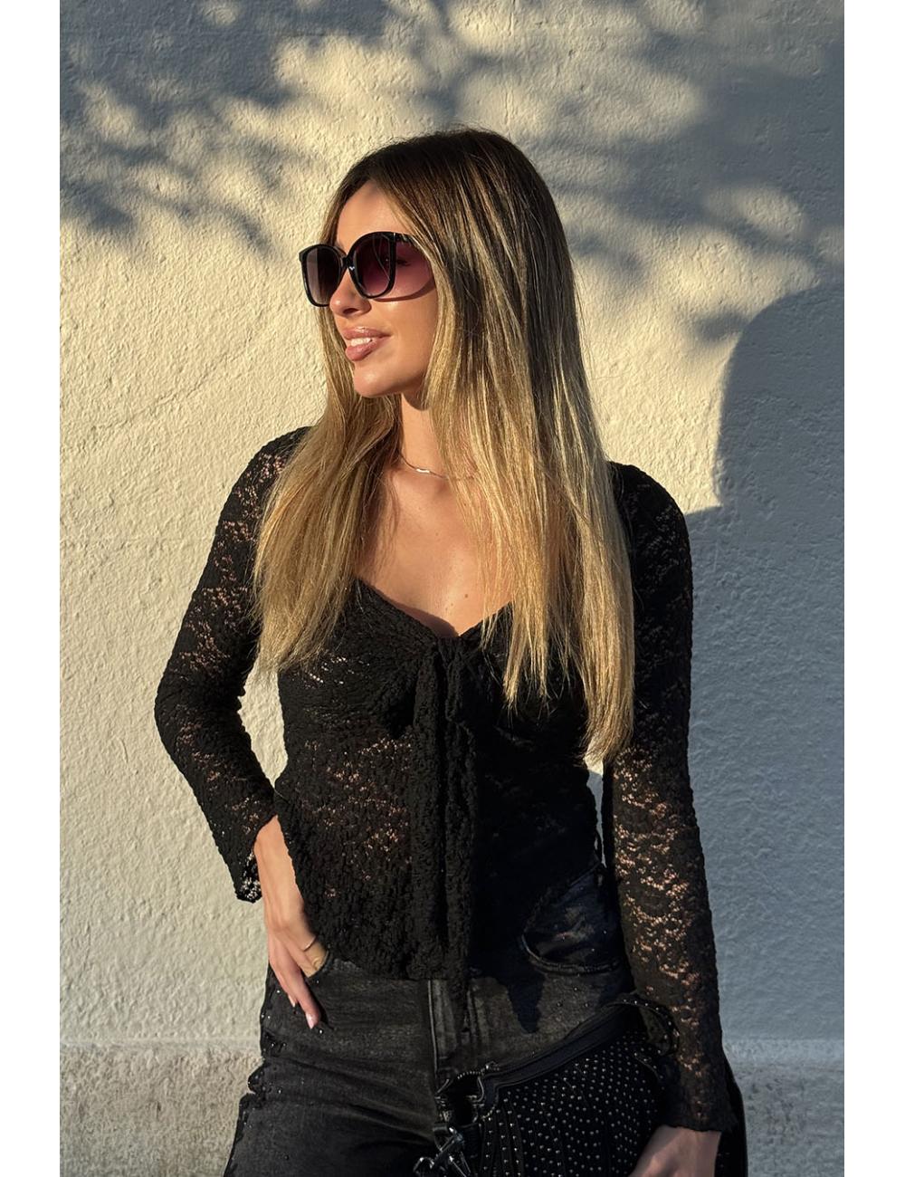 Blusa de manga larga confeccionada en blonda elástica. Cuello en V y detalle de lazo anudado delante. Las mangas y la parte inferior son semitransparentes. El pecho tiene forro para que no transparente.