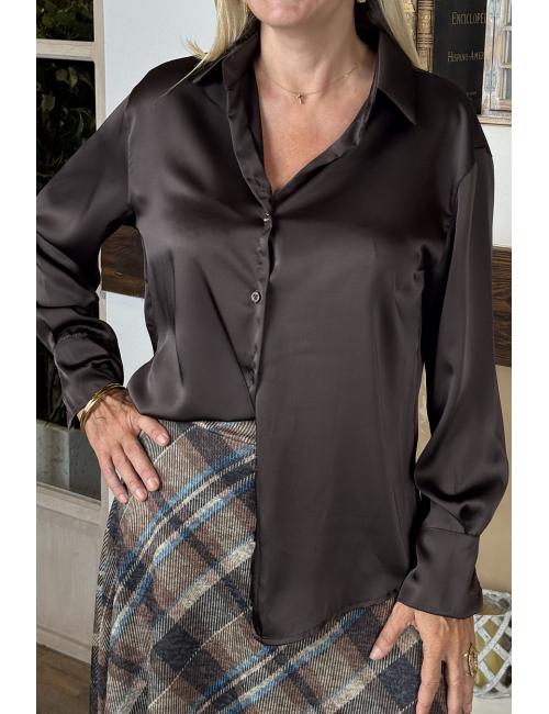 Camisa de manga larga confeccionada en raso satinado fluído. Cuello camisero clásico y cierre con 5 botones delante. Detalle de botón en puño.