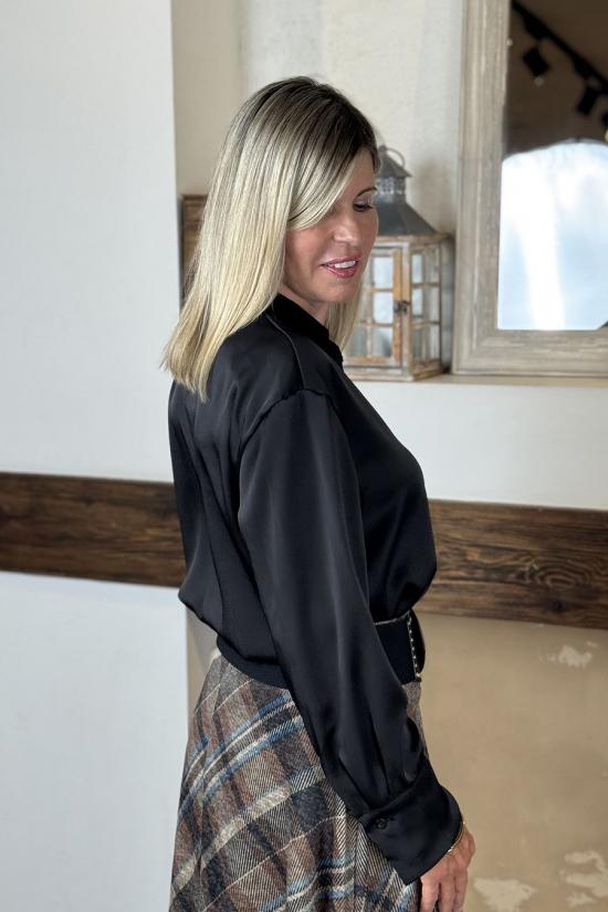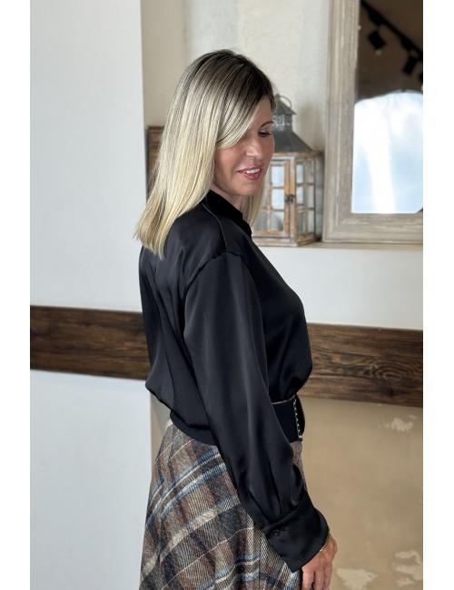 Camisa de manga larga confeccionada en raso satinado fluído. Cuello camisero clásico y cierre con 5 botones delante. Detalle de botón en puño.