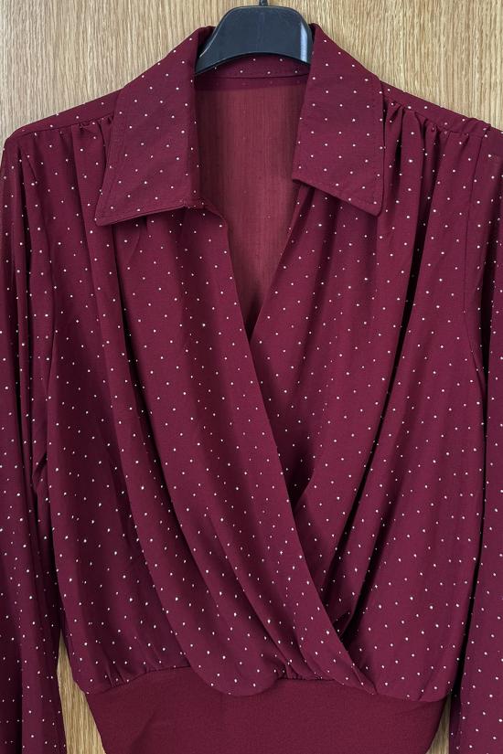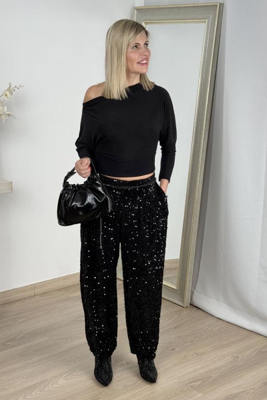 Blusa corta confeccionada en tejido elástico de lúrex brillante. Cuello semibarca, manga larga murciélago y cintura acabada en banda elástica.