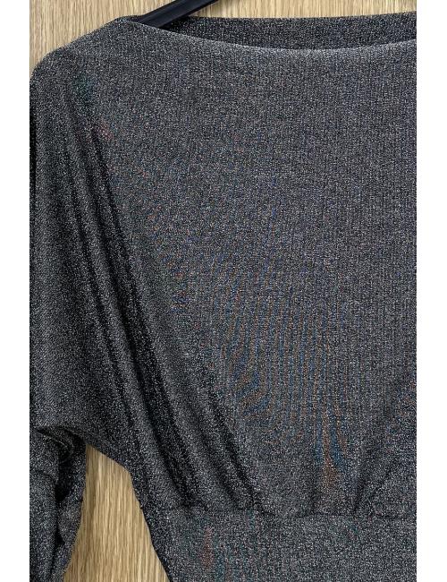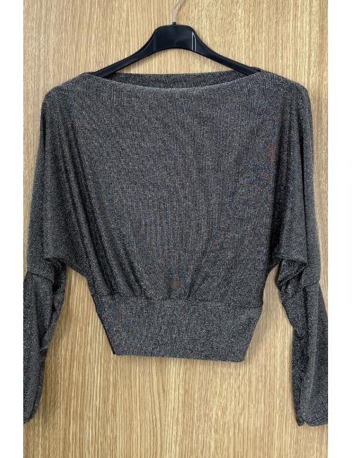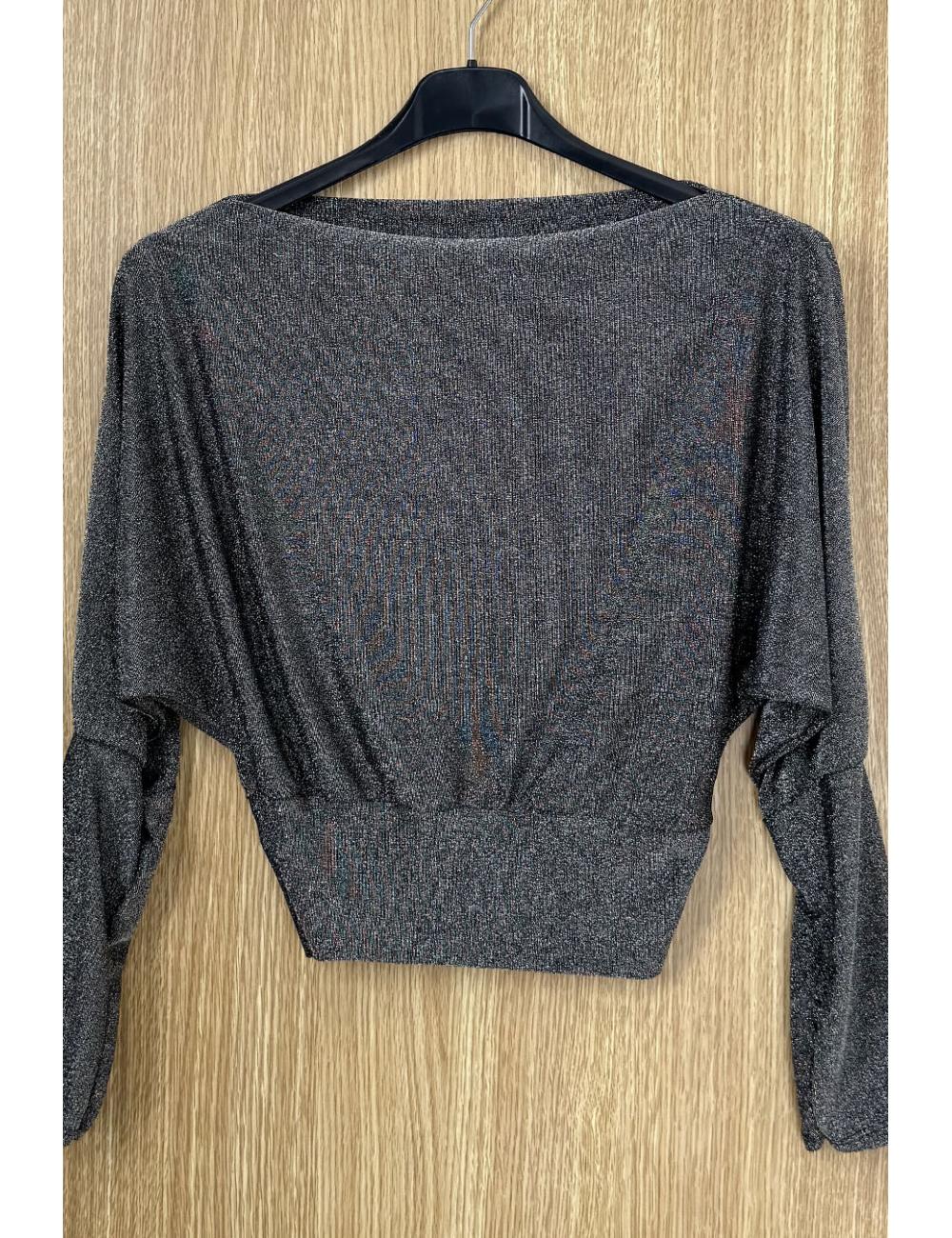 Blusa corta confeccionada en tejido elástico de lúrex brillante. Cuello semibarca, manga larga murciélago y cintura acabada en banda elástica.