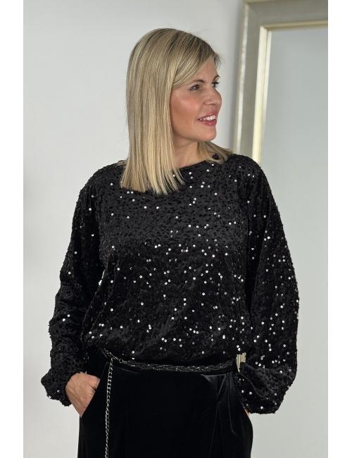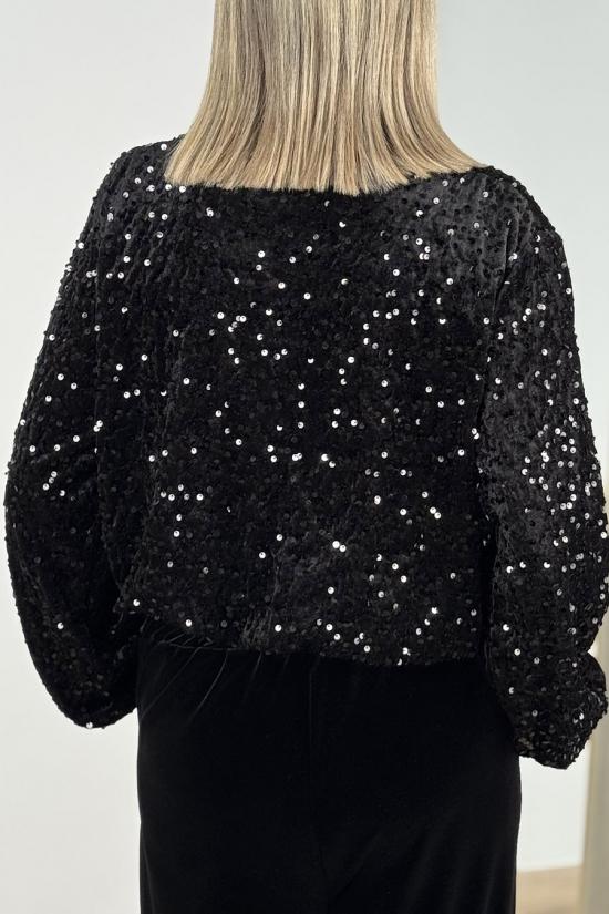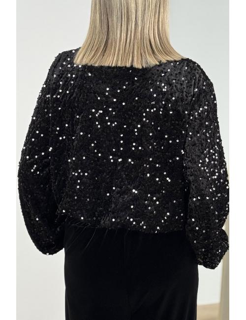 Blusa corta de manga larga, confeccionada en tejido de vellut forrado de lentejuelas. Cuello semibarca y mangas bombacho.