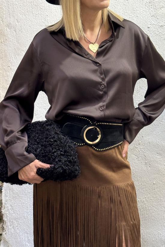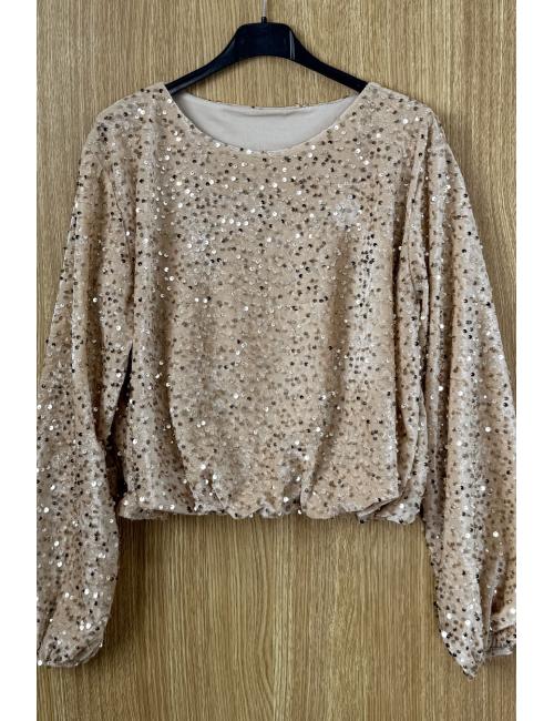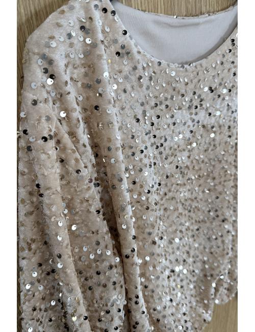 Blusa corta de manga larga, confeccionada en tejido de vellut forrado de lentejuelas. Cuello semibarca y mangas bombacho.