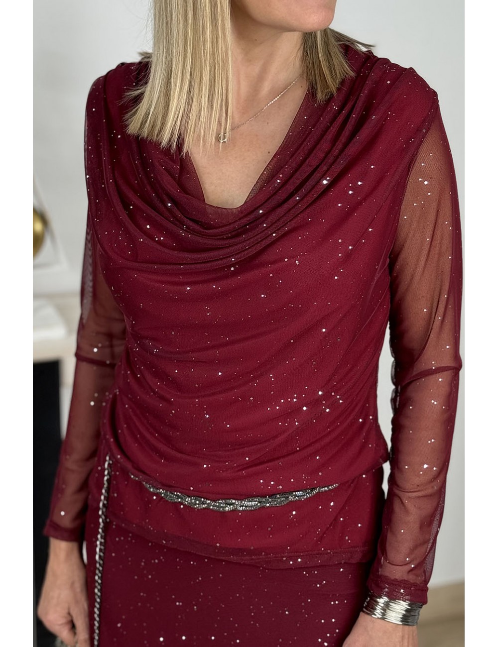 Blusa de manga larga confeccionada en tul fluído con detalle de brillantitos repartidos por toda la prenda. Forro interior y mangas semi-transparentes. Escote en cascada.