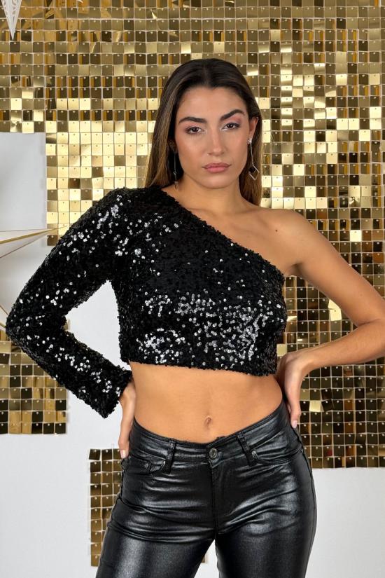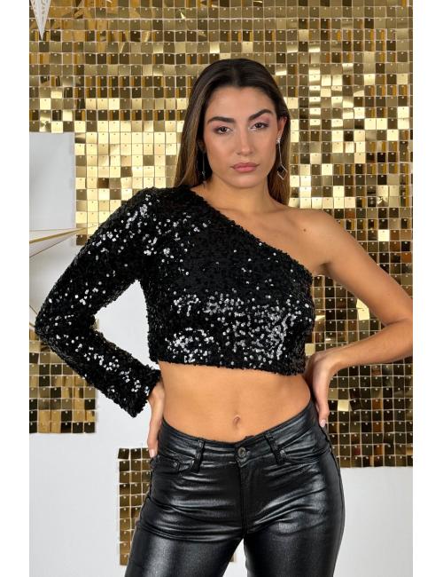 Crop top de lentejuelas con una manga larga y escote en diagonal.