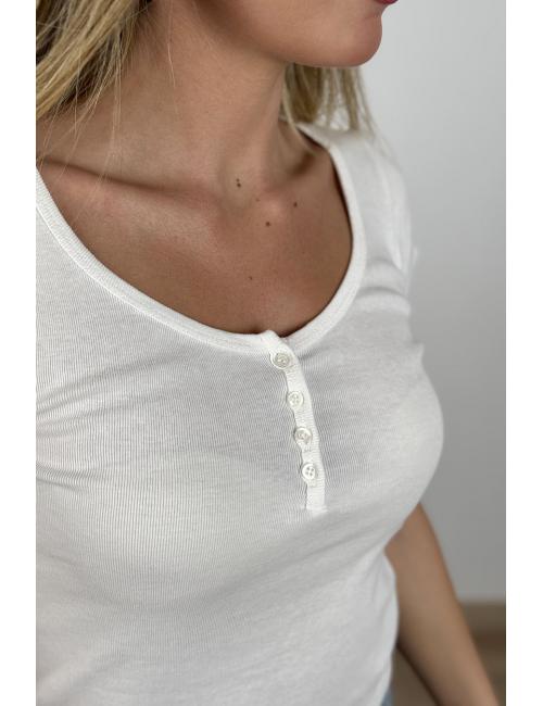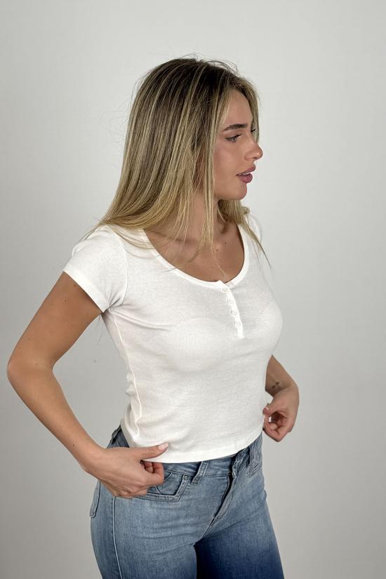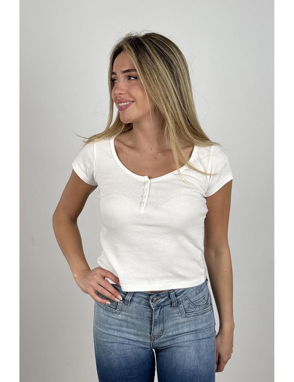 Camiseta de manga corta confeccionada en algodón. Cuello redondo abierto y cuatro botones delante. Un básico imprescindible para tus looks con jeans, faldas y shorts.