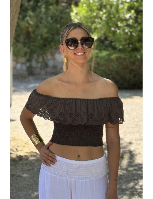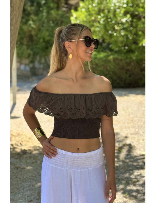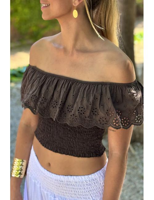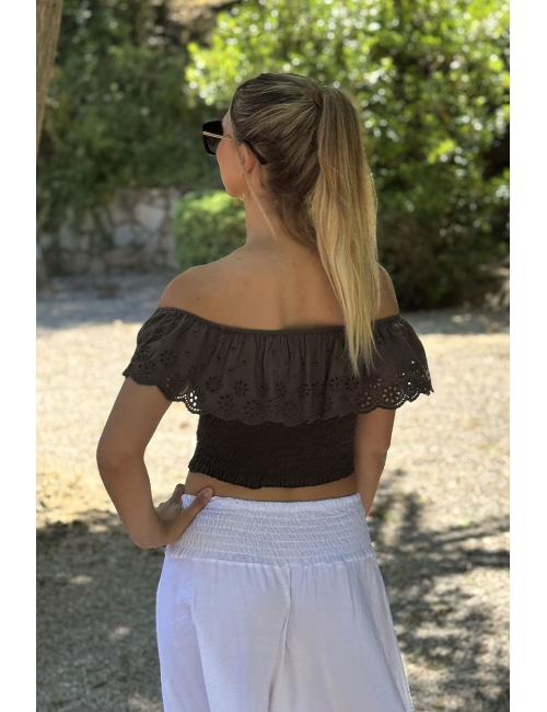 Crop top sin mangas con escote bardot elástico y bordado inglés. Cuerpo elástico nido de abeja.