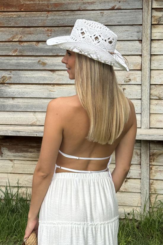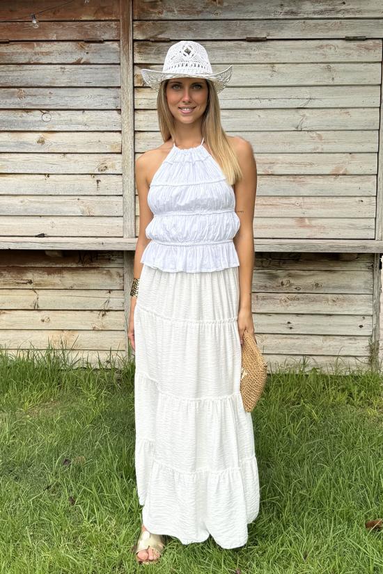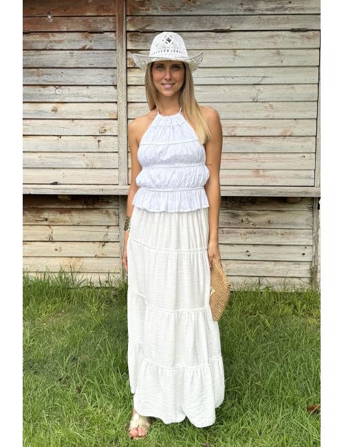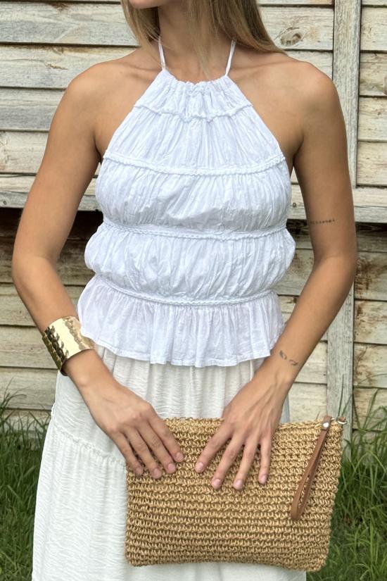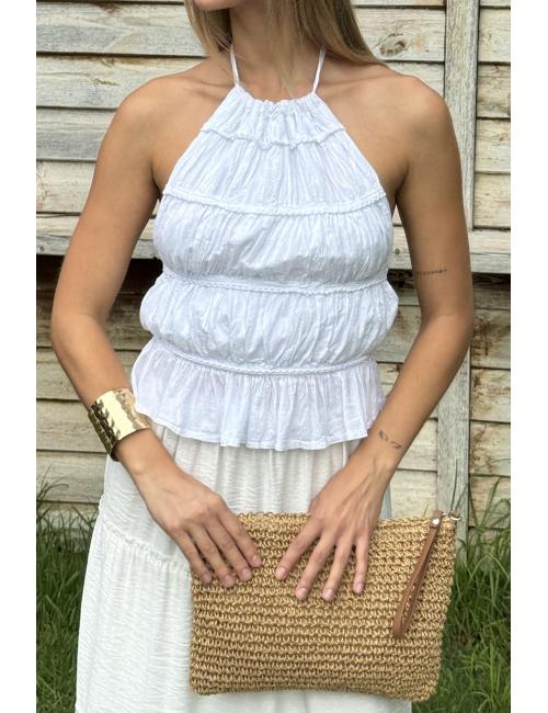 Top con volantes de estilo boho. Cuello hálter que va atado detrás mediante dos tiras finas. Incluyedos tiras horizontales en la espalda regulables.