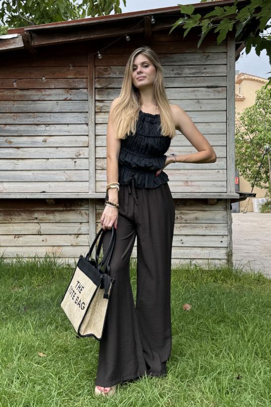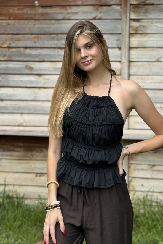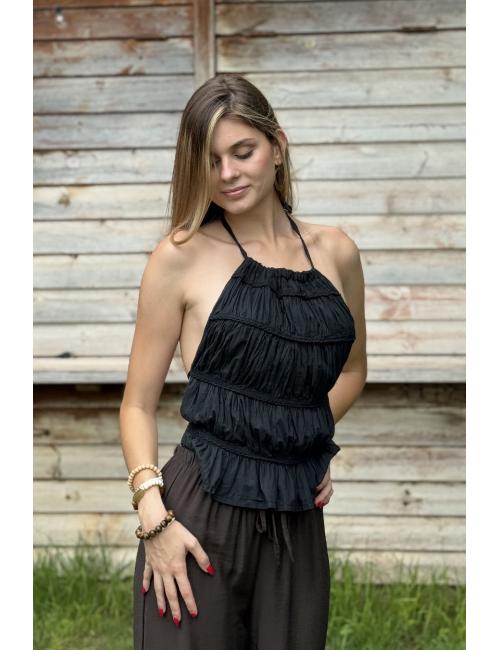 Top con volantes de estilo boho. Cuello hálter que va atado detrás mediante dos tiras finas. Incluyedos tiras horizontales en la espalda regulables.