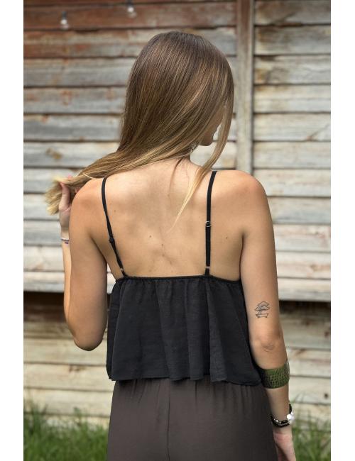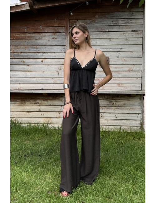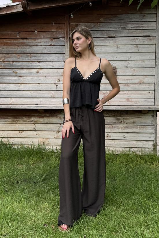 Crop top sin mangas ribeteado con tachitas metálicas. Incluye dos tirantes finos regulables en altura para un mejor ajuste. Cuello de pico. Parte inferior fluída con vuelo. Crop top perfecto para tus outfits boho chic, ideal con jeans, shorts y faldas.