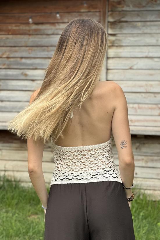 Crop top sin mangas abierto, confeccionado con crochet tupido en el pecho y calado en la parte inferior. Ajuste mediante tirantes atados al cuello y lazo delante en el escote. Espalda semi-descubierta. Crop top perfecto para tus outfits boho chic, ideal con palazzos, shorts y faldas.