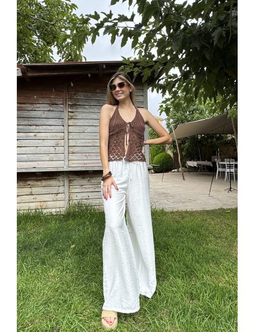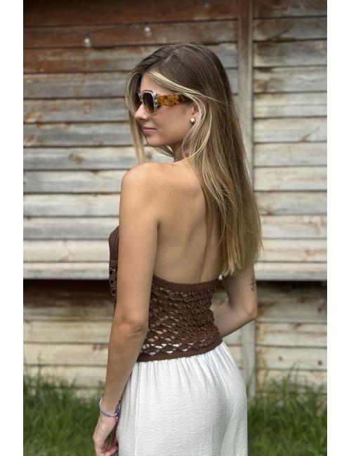 Crop top sin mangas abierto, confeccionado con crochet tupido en el pecho y calado en la parte inferior. Ajuste mediante tirantes atados al cuello y lazo delante en el escote. Espalda semi-descubierta. Crop top perfecto para tus outfits boho chic, ideal con palazzos, shorts y faldas.