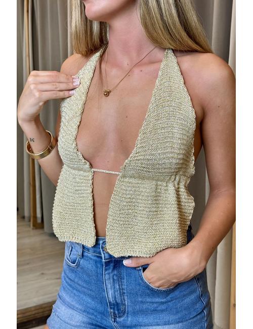 Top sin mangas abierto, confeccionado en crochet acabado con un toque de lurex brillante. Espalda descubierta.Ajuste mediante tirantes atados en cuello y espalda. El top tendencia ideal para darle un toque atrevido tus outfits boho chic con palazzos, shorts y faldas.