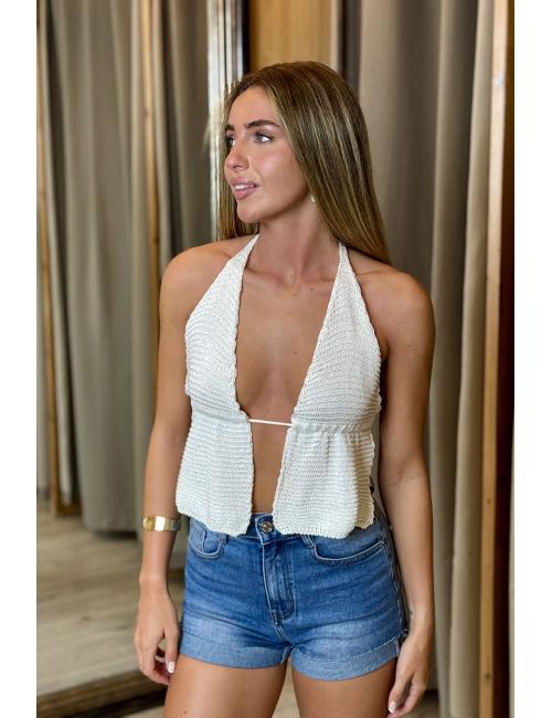 Top sin mangas abierto, confeccionado en crochet acabado con un toque de lurex brillante. Espalda descubierta.Ajuste mediante tirantes atados en cuello y espalda. El top tendencia ideal para darle un toque atrevido tus outfits boho chic con palazzos, shorts y faldas.