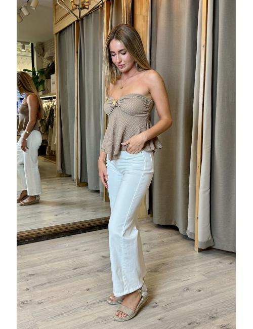 Top elástico con escote palabra de honor y fruncido delante. Incluye detalle de flor dorada metálica en el escote y copas en el pecho. Bajo fluído con forma irregular.