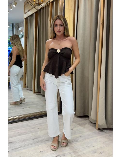 Top elástico con escote palabra de honor y fruncido delante. Incluye detalle de flor dorada metálica en el escote y copas en el pecho. Bajo fluído con forma irregular.
