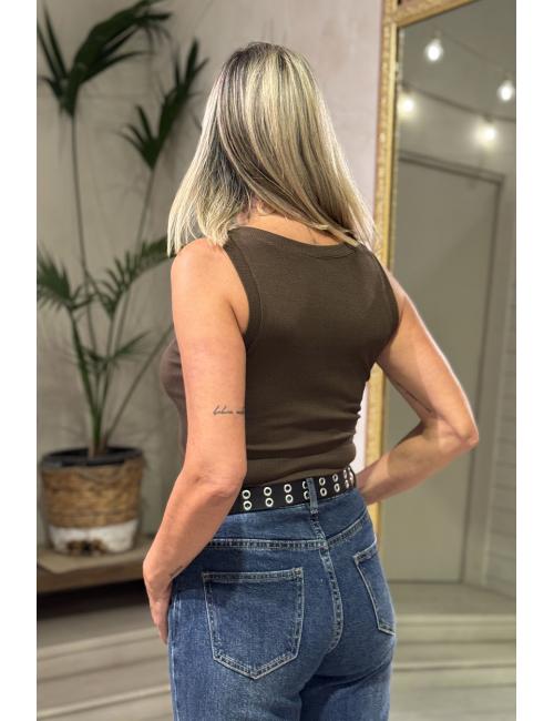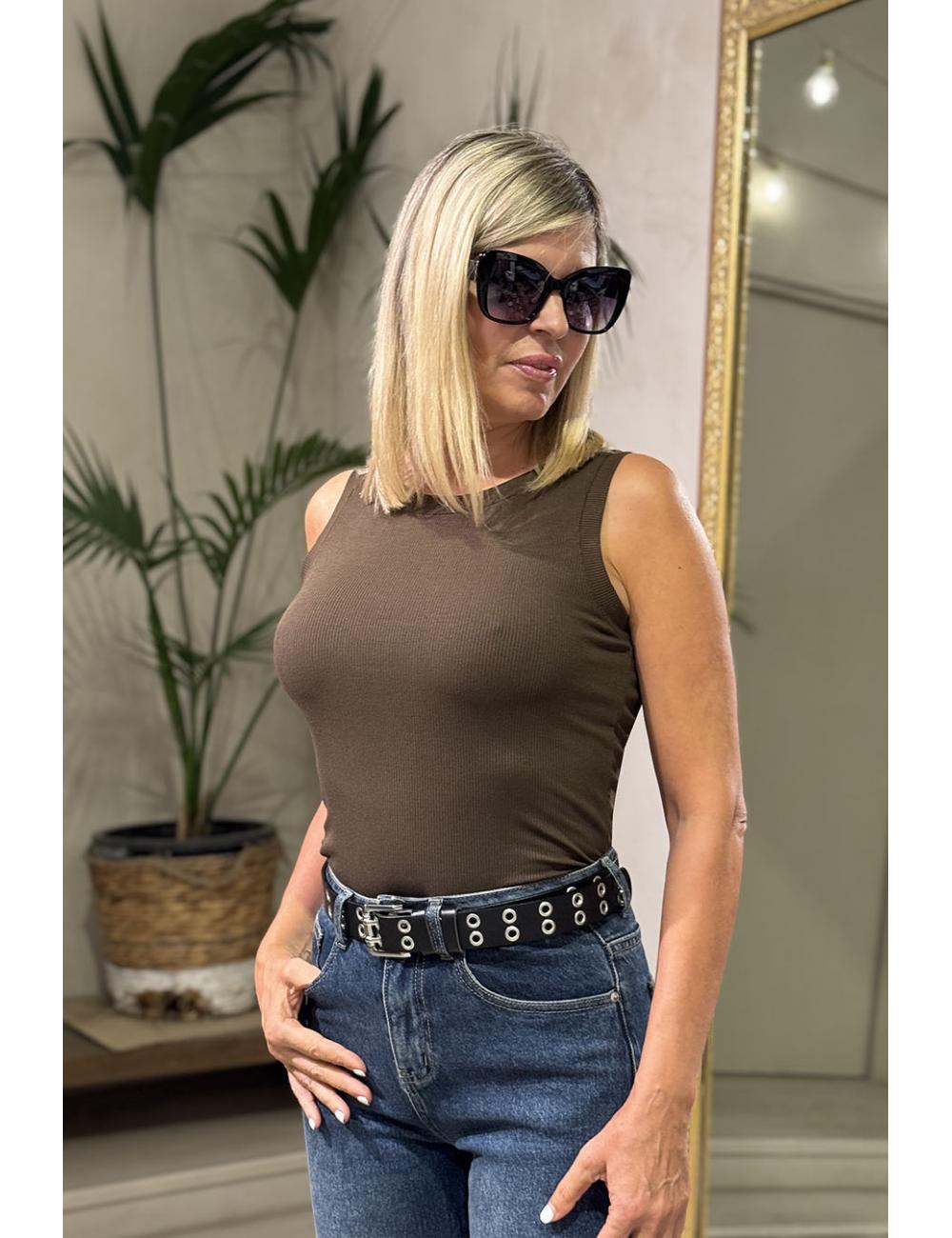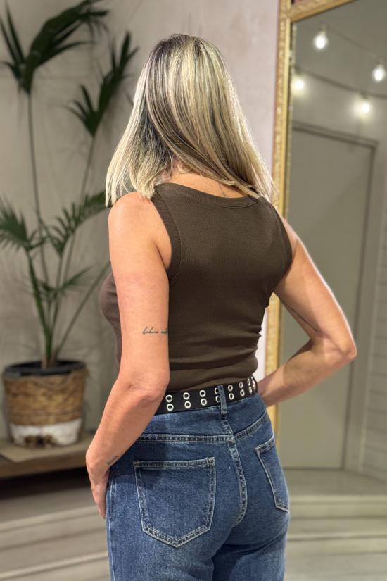 Camiseta sin mangas y cuello redondo. Confeccionada en algodón canalé suave. Un top versátil y perfecto para completar tus looks con estilo y sobriedad.