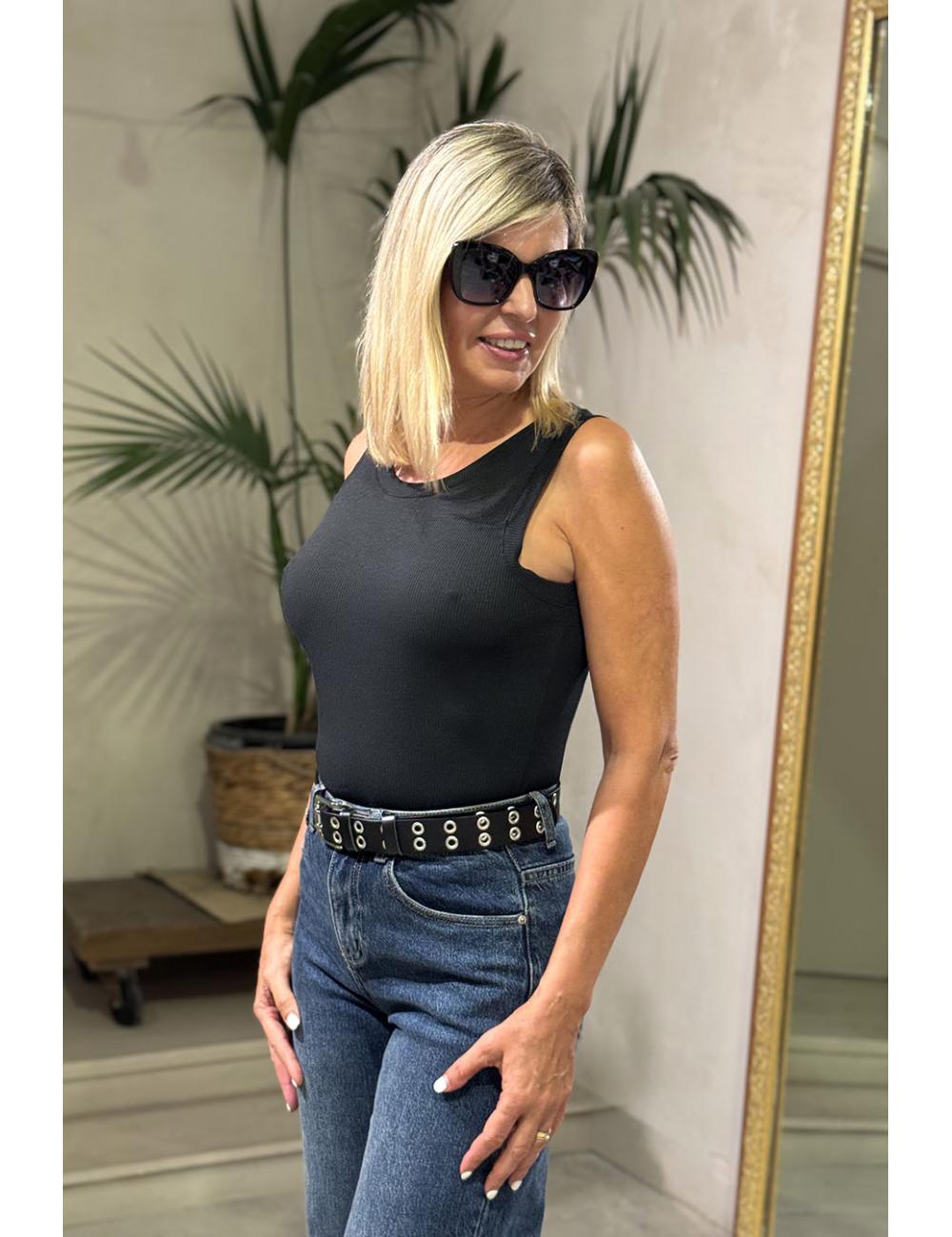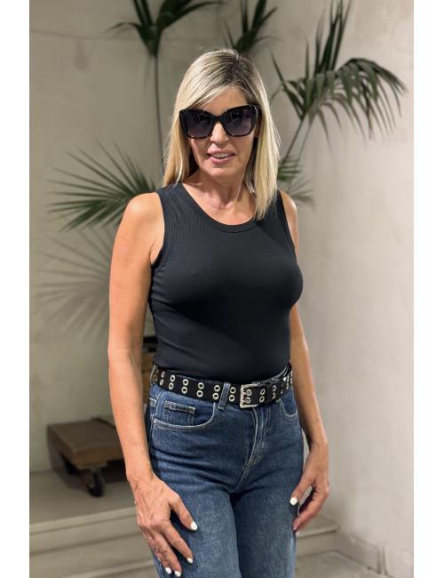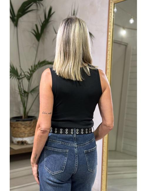Camiseta sin mangas y cuello redondo. Confeccionada en algodón canalé suave. Un top versátil y perfecto para completar tus looks con estilo y sobriedad.