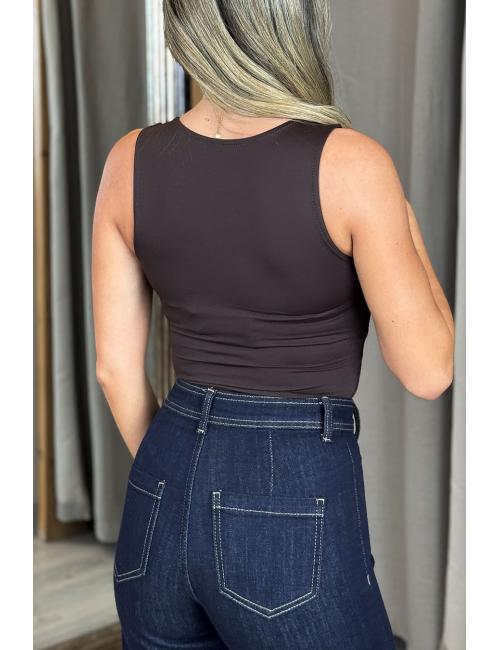 Body sin mangas ajustado con detalle dorado metálico en el centro del escote. Confeccionado en tejido tupido elástico liso. Cierre con botones metálicos a presión. La prenda todo terreno combinable con cualquier outfit.