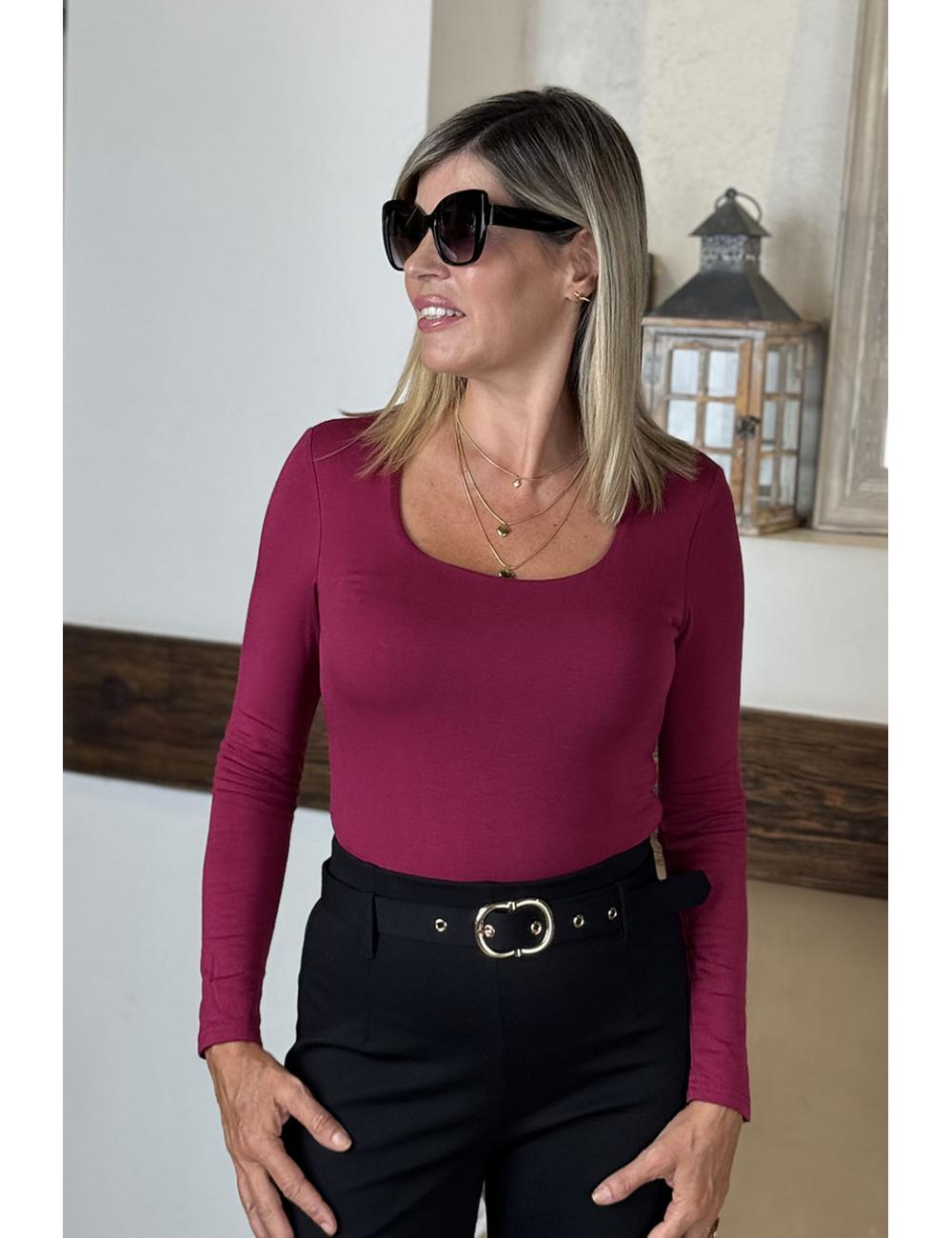 Top de manga larga y cuello redondo. Entallado y confeccionado en tejido suave elástico. Un básico ideal para tus outfits de diario o din de semana.