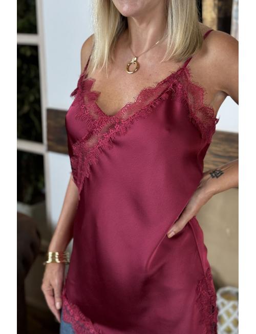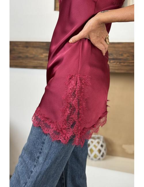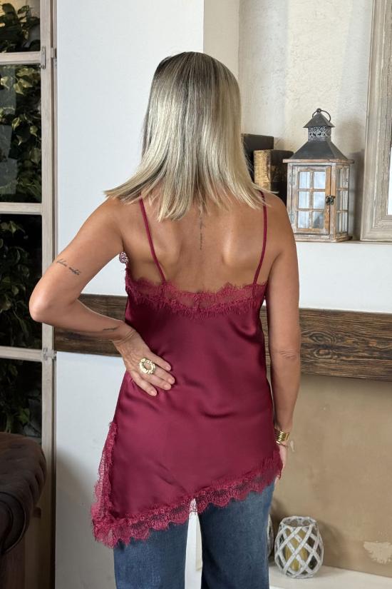 Top lencero de raso satinado. Bajo asimétrico y abertura lateral. Cuello en V,  tirantes finos y detalle de puntilla de blonda en bajo y escote. La prenda más versátil de la temporada, ideal para tus looks de día con vaqueros o leggins y de noche tal cual, o con unas simples medias.