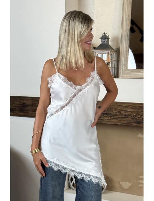 Top lencero de raso satinado. Bajo asimétrico y abertura lateral. Cuello en V,  tirantes finos y detalle de puntilla de blonda en bajo y escote. La prenda más versátil de la temporada, ideal para tus looks de día con vaqueros o leggins y de noche tal cual, o con unas simples medias.